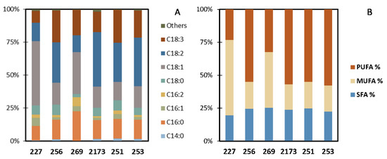 (A) FAME profile of six Chlorellaceae spp: C. vulgaris NIES 227, CCALA 256 & 269, C. sorokiniana NIES 2173 and P. kessleri CCALA 251 & 253. (B) Saturation distribution: Saturated fatty acids (SFA), Monounsaturated fatty acids (MUFA), Poly-unsaturated fatty acids (PUFA).
