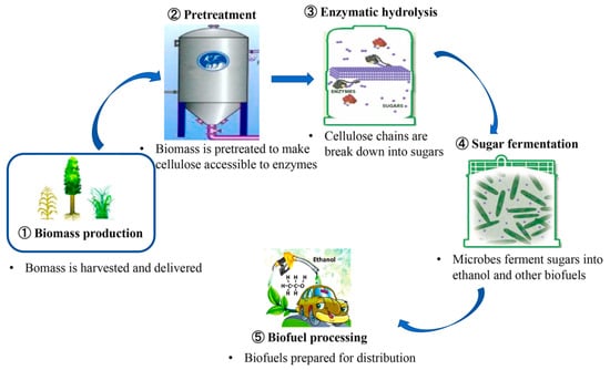 Bioconversion of lignocellulosic biomass to biofuel via feedstock production, biomass pretreatment, enzymatic hydrolysis, sugar fermentation, and biofuel processing [].