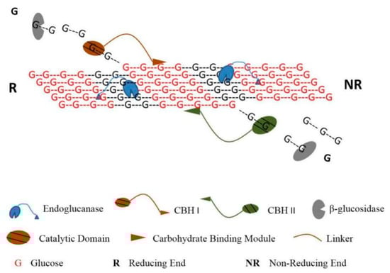 The action of various cellulases enzymes on surface layer of cellulose [].