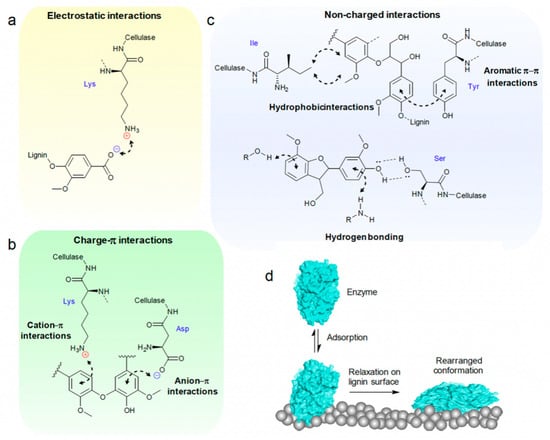 The main interactions between cellulose enzyme and lignin (a–c) that lead to the adsorption, structural rearrangements, and irreversible binding of enzymes on the surface of lignin (d) [].