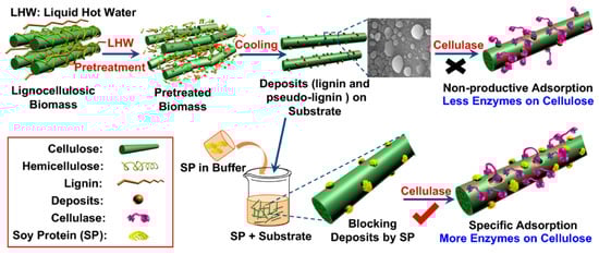 A proposed mechanism of the soy protein enhanced enzymatic hydrolysis of liquid hot water pretreated lignocellulosic biomass [].