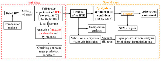 In this study, the two-stage thermal-chemical process was explored to evaluate the production of saccharides and biochar. First, saccharides production from the buckwheat waste was feasible by HTE. Our study revealed that the SSY was 4.10%, with a lower total byproduct yield of 1.92% and a relatively higher percentage solid recovery of 65.49% under HTE conditions of 160 °C for 30 min (SF = 3.24). In addition, the adsorption of biochar from the residue was stronger than the biochar pyrolysis from raw BW. In particular, the decolorization of methyl orange was more pronounced to achieve 31.11% at 7 h. Therefore, our results indicated the feasibility of the two-stage thermal-chemical process combining HTE with pyrolysis to produce a substantial yield of saccharides and biochar from BW.