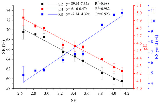 Relationships between the SF (severity factor), SR (percentage solid recovery), pH, and RS (reducing sugar) yield in the HTE of BW under the first stage.