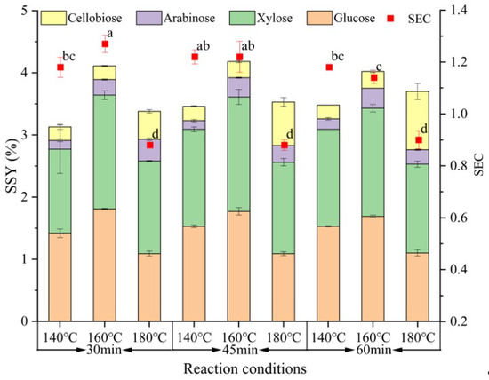 The SSY (cellobiose, glucose, xylose, and arabinose) and SEC are shown in Figure 3. The higher SSY was obtained at 160 °C with a significant difference (p < 0.05) compared with other temperatures, while different residence time was not affected (p > 0.05). A maximum value of 4.18% was achieved at 160 °C for 45 min (SF = 3.42). It was less than our expected result because some of the polysaccharides in the hydrolyzate were not completely degraded to monosaccharides, as shown in Figure S1. The SEC was low at an SF of 3.83, 4.01, and 4.13, due to the degradation of saccharides to byproducts at the higher SF. Moreover, the SEC was much higher (p < 0.05) in the SF of 2.65, 3.24, and 3.42. The maximum SEC (1.27) was obtained at 160 °C for 30 min (SF = 3.24). In this case, a relatively larger saccharides yield (4.10%) was obtained with less energy consumption, while the byproducts yield (1.92%) was lower with a profitable percentage solid recovery (65.49% in Table 2), which could be reused in the second stage.