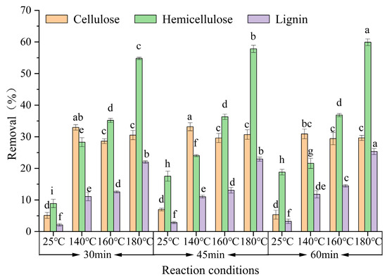 where R(C, H, L) is the percentage removal of cellulose, hemicellulose, and lignin, respectively, and m(C, H, L) is the mass of cellulose, hemicellulose, and lignin, respectively.