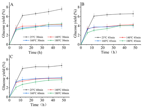 Effect of HTE conditions on the glucose yield after enzymatic hydrolysis for 48 h in the second stage. (A): 30 min with different temperature of THE, (B): 45 min with different temperature of THE, (C): 60 min with different temperature of THE).