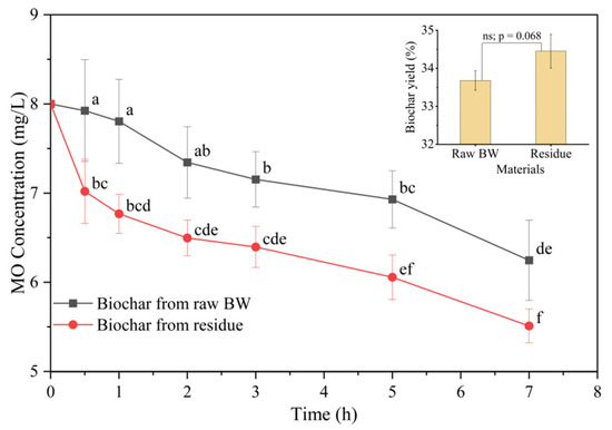 Biochar yield after pyrolysis in the second stage and decolorization of MO (methyl orange) during 7 h reaction by raw BW and residue of HTE (160 °C, 30 min). The alphabets on the bar graph indicate statistical difference (p < 0.05).