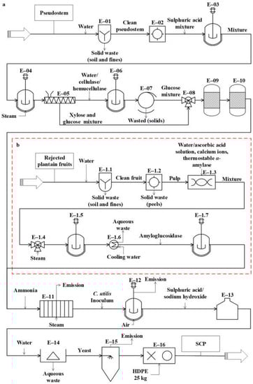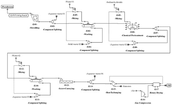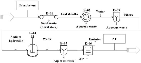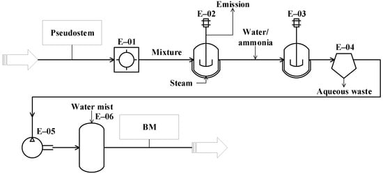 Figure 3) starts with the grinding operation (E-01), where the pseudostems are reduced in size down to particles between 1 and 2 mm. Then, the particles are pretreated (E-02) by steam explosion at 200 °C for 76 min [