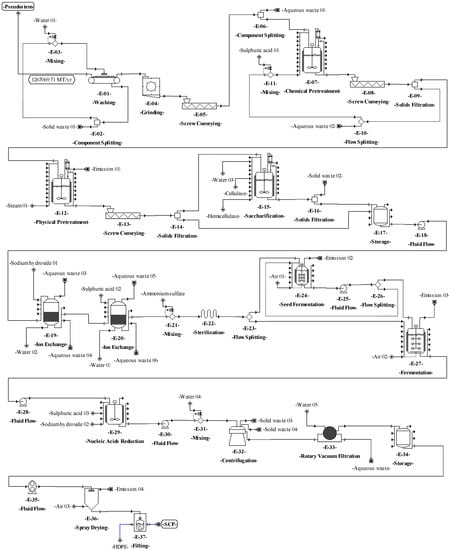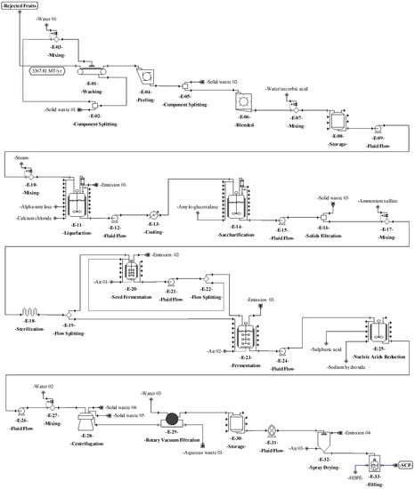 Figure 4). For SCP production from RUPFs, the equipment units for transferring liquids (E-09, E-12, E-15, E-21, E-24, E-26, and E-31) and for balance storage (E-08, and E-30) were included as well (