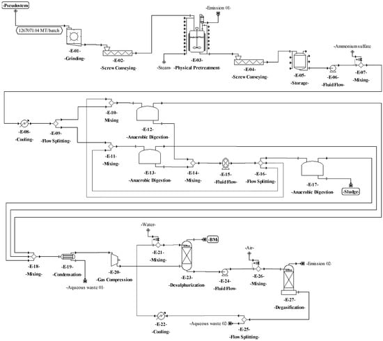 80]. During the anaerobic digestion (E-03), a solution containing 5 g/L ammonium sulfate is added to the mixture as a nitrogen source for the microorganisms. The process is performed under slow continuous stirring at 40 °C for 30 days [