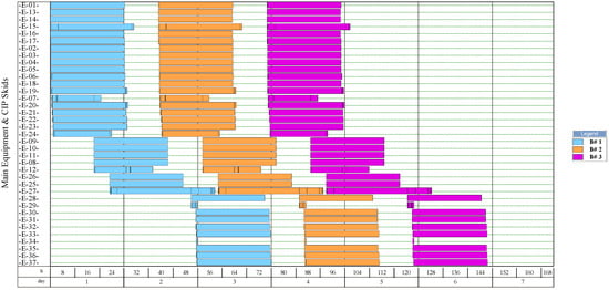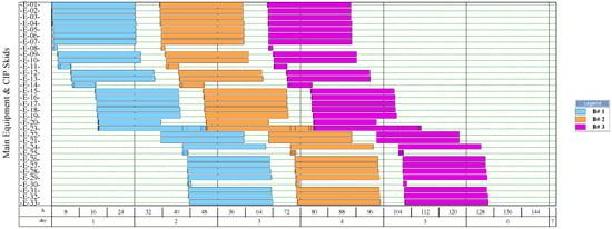 Figure 11, where the equipment occupancy charts are presented. These charts show that some equipment units were scheduled to operate in parallel without waiting for the previous equipment to finish its operation. For example, in batch 1 (