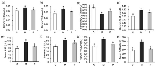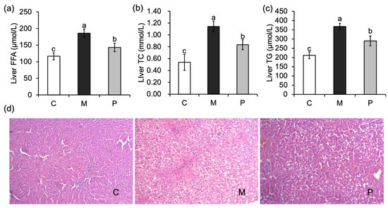 The liver FFA, TC and TG levels were significantly increased in group M compared with group C (p < 0.05). After the intervention of Lactobacillus rhamnosus hsryfm 1301 fermented milk, the liver FFA, TC and TG contents of rats in the group P were significantly reduced compared with those in the group M (p < 0.05) (Figure 2a–c), indicating that Lactobacillus rhamnosus hsryfm 1301 fermented milk could reduce the fat accumulation and free fatty acids in liver tissues, and had a modulating effect on the disorder of lipid metabolism induced by a high-fat diet.