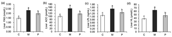 The levels of liver LPL and HL were significantly increased (p < 0.05) in group M compared with group C (Figure 3c,d), indicating that the rate of lipolysis in the liver of rats was exacerbated by the intake of a high-fat diet. After Lactobacillus rhamnosus hsryfm 1301 fermented milk intervention, the levels of liver LPL and HL in rats in the group P were significantly decreased (p < 0.05) compared with the group M, and fat lipolysis gradually returned to the normal rate.