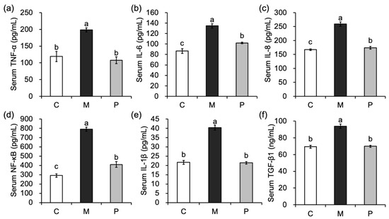 Effect of Lactobacillus rhamnosus hsryfm 1301 fermented milk on serum inflammatory response of rats (n = 9). (a) Rats serum TNF-α, (b) rats serum IL-6, (c) rats serum IL-8, (d) rats serum NF-κB, (e) rats serum IL-1β, (f) rats serum TGF-β1.
