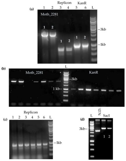 When creating the plasmid shuttle vector for M. thermoacetica, the thermostable kanamycin resistance gene, kanR [] was controlled by M. thermoacetica native promoter, PG3PD as previously reported []. In addition to appropriate selective pressure, a replicon (i.e., the origin of replication and any replication-related genes) is crucial to maintain the plasmid within the population, allowing plasmid replication. This element must be compatible with the chosen host organism for successful plasmid maintenance. Unfortunately, no straight-forward method to predict compatibility has been established to date; instead, a trial-and-error method is used. To do so, several candidate replicons were selected based on their previously reported compatibility with thermophilic organisms or their species of origin (Table 5). In addition to the candidate replicons, M. thermoacetica chromosomal origin was used as a potential plasmid replicon. This approach has, in fact, proven to be successful in transforming non-model organisms [], as it ensures compatibility between the host and the plasmid; it, however, may lead to unwanted recombination events between the plasmid and the chromosome. To test compabitility of the chosen candidates, the replicon was amplified from their respective plasmid (Table 5) and cloned into a shuttle vector, which also carried a Gram-negative replicon and a selection marker.