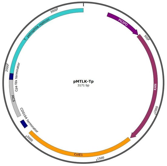 The designed plasmid shuttle vector pMTLK-Tp contains T. petrophila pRKU1 replicon and the thermostable kanR gene, expressed with the PG3PD promoter for plasmid maintenance and selection, respectively, in M. thermoacetica. It also harbours the ColE1 Gram-negative replicon and a multiple cloning site (MCS) for easy downstream cloning.