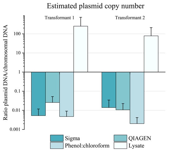 Estimated plasmid copy numbers using qPCR-measured fluorescence. Three genomic DNA (gDNA) extraction methods were explored and compared to boiled crude lysates, highlighting that gDNA might not be an appropriate template for qPCR, as previously observed. Error bars represent standard deviation (n = 12).