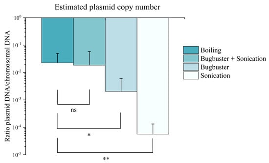 Estimated plasmid copy numbers, as measured by qPCR fluorescence, in gDNA samples obtained by using different lysis methods. Boiling and Bugbuster followed by sonication led to similar results. Error bars represent standard deviation (n = 12). Statistical significance was calculated with a two-tailed t-test: n.s. = p > 0.05; * = p < 0.05; ** = p < 0.01.