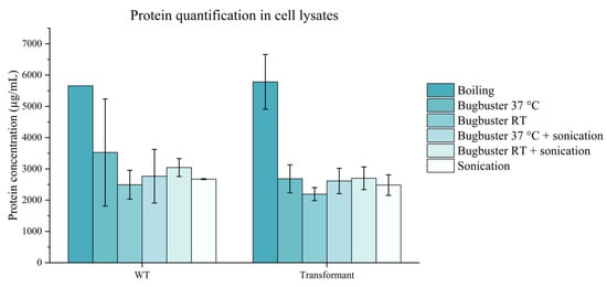 Total protein concentration in cell lysate samples, quantified by the BCA assay. Different lysis methods were investigated on wild-type (WT) cells and transformant cells to exclude that the plasmid was impacting lysis efficiency. Error bars represent standard deviation (n = 3). RT = room temperature.