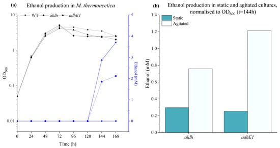 Comparison of ethanol production in M. thermoacetica under different conditions. (a) Ethanol production in M. thermoacetica by expressing aldh and adhE1 genes. Ethanol was only detected in the late stationary phase. OD600 and ethanol concentration (mM) are represented in black and blue, respectively. Square: WT; circle: aldh mutant; triangle: adhE1 mutant (b) Ethanol production at t = 144 h in static and agitated M. thermoacetica cultures. No ethanol was detected in the wild-type strain.