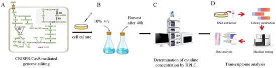 Schematic diagram of relevant experimental processes of this study. (A) Strategy of strain transformation used in this study. (B) Shake-flask fermentation experiment. (C) Determination of cytidine concentration by HPLC. (D) Transcriptome analysis process.