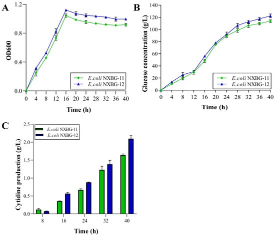 To achieve the accumulation of cytidine, the uridine-cytidine kinase encoded by the gene udk was successively knocked out to block the generation of cytidylic acid after the reverse reaction of cytidine phosphorylation. To investigate the effect of the produced E. coli NXBG-12 gene deletion mutant strain on cytidine synthesis by fermentation, the strain and the starting strain E. coli NXBG-11 were treated to 40 h of shake-flask fermentation (Figure 1B). During the fermentation process, samples were obtained every 4 h to identify the bacterial cytidine content and cell density. As may be seen in Figure 2A, E. coli NXBG-12 grew somewhat faster than the initial strain E. coli NXBG-11, demonstrating that the deletion of the udk gene had no effect on bacterial growth. This is consistent with previous reports []. The rate of glucose intake increased in 8~20 h (Figure 2B), possibly due to the fast growth and cytidine production of bacteria utilizing glucose in the fermentation broth. The mutant strain’s sugar consumption was 1.08 times that of the original strain and its cytidine content was 1.28 times that of the original strain (Figure 2C). After 40 h of fermentation, the cytidine content reached 2.1 g/L and its glycoside conversion rate was 1.19 times that of the original strain (Table 1), indicating that it was significant for the accumulation of cytidine by cutting off the reverse reaction of cytidine to produce CMP. Although the cytidine titre of E. coli NXBG-12 in this study was lower than that of some improved strains, the growth of E. coli NXBG-12 was not greatly affected, indicating its potential for further reconstruction. and other unknown cytidine catabolic pathways may exist.