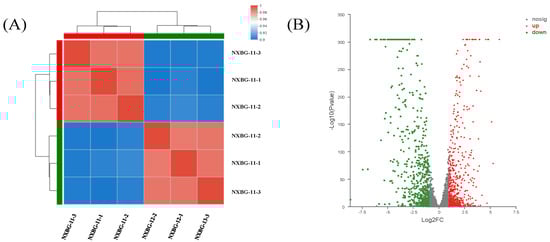 The total RNA was isolated with high purity from the aforesaid wild E. coli and recombinant strains and the transcriptome sequenced using an Illumina HiSeq system. To achieve clean reads, the original data were filtered by quality control. The sequence quality evaluation values Q20 were all >98%, Q30 were all >95%, and the error rates were all <0.235, suggesting that the sequencing data were of high quality and dependable, and could be used for further information analysis. Specific statistics can be found in Table S4. Clean reads of six samples after quality control and comparison with the reference genome E. coli K12 MG1655 revealed that, on average, 99.08% of the three E. coli NXBG-11 samples matched the reference genome and 98.1% matched the unique site of the reference genome. On average, 77.75% of the three mutant strain E. coli NXBG-12 samples matched the reference genome, and 76.53% matched the unique site of the reference genome, indicating that the sequencing data are reliable (Table S5).