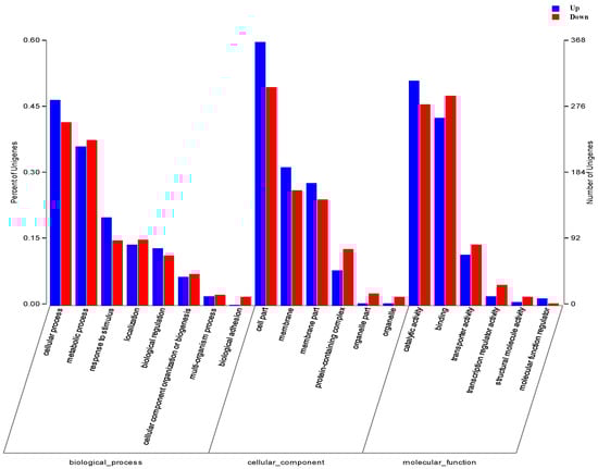 GO enrichment analysis histogram of DEGs. The abscissa represents the three branches of GO, namely biological processes, cell components, and molecular functions, and further level 2 classification; the ordinate represents the relative proportion of genes.