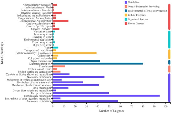 KEGG histogram of DEG. The ordinate is the name of the KEGG metabolic pathway, and the abscissa is the number of genes annotated to the pathway.