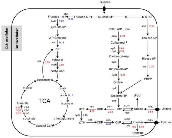 Schematic diagram of gene expression involved in cytidine synthesis-related pathways. Numbers represent the difference multiple of a gene between E. coli NXBG-11 and E. coli NXBG-12, blue representing downward adjustment and red representing upward adjustment.