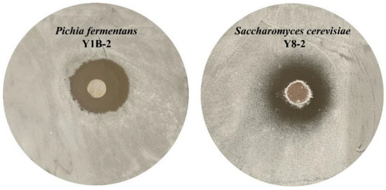 A total of 50 strains (including 23 bacteria, 22 yeasts, and 5 mold) were isolated from the medium-temperature Daqu. These strains were used for antagonism against Streptomyces albus by modified agar well-diffusion assay [46]. Finally, six strains, including five yeasts and a Bacillus strain, with R inhibition zone/R colony > 1.50 were chosen as the geosmin-inhibiting microorganisms [2]. These six strains were Pichia fermentans Y1B-2, Pichia fermentans Y1A-1, Pichia kudriavzevii MY5-2, Saccharomyces cerevisiae Y8-2, Issatchenkia orientalis Y2A-1, and Bacillus subtilis J7-4. The sketch map of the antibacterial experiment is shown in Figure 1. The R inhibition zone/R colony values of these strains are shown in Table 1.