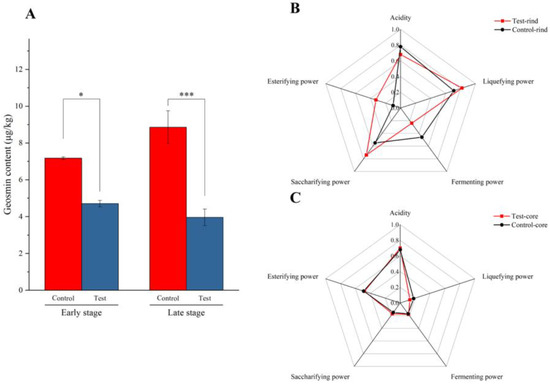 (A) Geosmin content in the early stage and late stage during Daqu incubation. *, p < 0.05; ***, p < 0.001. (B) The physicochemical characteristics in the rind of the Daqu. (C) The physicochemical characteristics in the core of the Daqu. The red line represents the test group; the black line represents the control group.