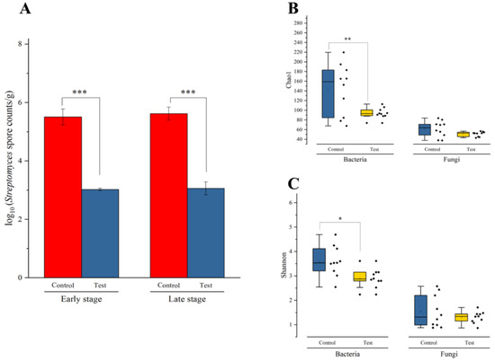 qPCR was applied to detect the dynamics in the Streptomyces albus biomass during Daqu fermentation. Figure 3A shows the total biomass of Streptomyces albus in the early stage and late stage during Daqu fermentation. In the early stage, the biomass of Streptomyces albus was 3.02 ± 0.08 log10 spore count/g in the test group, which was significantly (p < 0.001) lower than that in the control group (5.51 ± 0.48 log10 spore count/g). Streptomyces albus was reduced by 45.20% in the early stage after inoculation with geosmin-inhibiting microorganisms. In the late stage, the biomass of Streptomyces albus in the test group was 3.06 ± 0.39 log10 spore count/g, whereas it was 5.62 ± 0.39 log10 spore count/g in the control group; thus, significantly (p < 0.001) decreased by 45.60%.