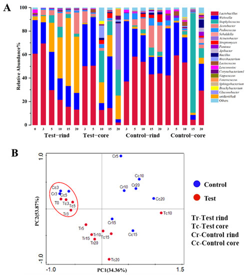 Principal component analysis (PCA) of the bacterial community was carried out based on weighted UniFrac distances (Figure 4B). The two axes explained 34.36% and 53.87% of the variance in bacterial community differentiation, respectively. Results showed that the bacterial community structure in the test group and the control group of Daqu in the first five days of fermentation were close and differentiated from the other samples. From the 10th day, the bacterial communities of the control group and the test group began to show greater differences. It can be seen that the bacterial community mainly play an important role in the 5 days to the 20 days during Daqu fermentation. Lactobacillus and Weissella were the most abundant (with over 20% average abundance) genera in Daqu. In addition, Staphylococcus, Acetobacter, Pediococcus, Sebaldella, Acinetobacter, Streptomyces, and Pantoea were also abundant (with over 1% but under 20% average abundance) in the Daqu. During fermentation, Lactobacillus and Weissella in the rind and the core of the Daqu were the most abundant at the beginning of fermentation (in the first 3 days of fermentation). After fermenting for 3 days, Lactobacillus decreased in the test group, and was lower in the test group than that in the control group at the end of fermentation. In the rind of Daqu, the relative abundance of Lactobacillus, Staphylococcus, Pediococcus, Acetobacter, Streptomyces, and Bacillus were lower in the test group than those in the control group; whereas the relative abundance of Weissella and Acinetobacter were higher in the test group than those in the control group at the end of fermentation. In the core of the Daqu, the relative abundance of Lactobacillus, Weissella, Streptomyces, Acetobacter, Pediococcus, Sebaldella, Pantoea, Apibacter, Bacillus, and Lactococcus were lower in the test group than those in the control group; whereas the relative abundance of Staphylococcus, Acinetobacter, Brevibacterium and Enterococcus were higher in the test group than those in the control group at the end of fermentation (Figure 4A).