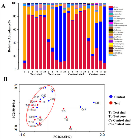 For fungi, the two axes explained 36.51% and 50.49% of the variance in the fungal community, according to the PCA analysis (Figure 5B). Results showed that the fungal community structure of the core of the Daqu in both the test group and control group in the first five days differentiated from the other samples, and the fungal community showed obvious clustering in the next 15 days. Combined with the relative abundance analysis of Pichia and Saccharomyces, it can be seen that the fungal community plays an important role in the first five days of Daqu incubation. What is more, seven fungal genera were abundant (with over 1% average abundance) in the Daqu samples. Pichia and Thermoascus were the most abundant (with over 25% average abundance) genera in Daqu. Meanwhile, Lichtheimia, Aspergillus, Rhizopus, and Saccharomyces were also abundant (with over 1% but under 20% average abundance) in Daqu. During fermentation, Pichia dominated in the rind of the Daqu and Thermoascus dominated in the core of the Daqu. In the rind of the Daqu, the relative abundance of Pichia and Candida in the test group was lower than in the control group, and the relative abundance of Thermoascus, Lichtheimia, Rhizopus, Saccharomyces, and Aspergillus was higher in the test group than those in the control group at the end of fermentation. In the core of the Daqu, it can be clearly seen that the domination of Pichia was gradually replaced by Thermoascus as the Daqu fermentation proceeded. Pichia decreased and Thermoascus increased both in the test and control group during fermentation. On the 5th day of Daqu fermentation, the relative abundance of Pichia was 81.5% in the test rind of the Daqu, 73.9% in the control rind of the Daqu, 26.7% in the test core of the Daqu, and 19.9% in the control core of the Daqu. The relative abundance of Saccharomyces was 1.4% in the test rind of the Daqu, 0.7% in the control rind of the Daqu, 0.9% in the test core of the Daqu, and 0.4% in the control core of the Daqu (Figure 5A).