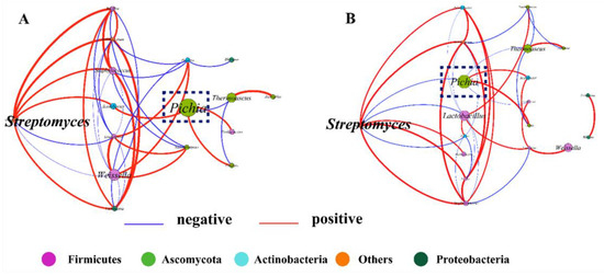 Relationships among microbial communities in the control group (A) and test group (B). A connection represents a significant (p < 0.05) and strong (Spearman’s |ρ| > 0.6) correlation. The size of each node is in proportion to the relative abundance of each microorganism, and the nodes are colored by phylum (Firmicutes, purple; Ascomycota, green; Actinobacteria, blue; others, orange; Proteobacteria, dark green.). The Spearman’s correlation coefficient (ρ) is in proportion to the thickness of each connection (edge) between two nodes. The color of the edges represents the positive (red) or negative (blue) relationship. The Pichia circled in the box is the main microorganism that inhibits the growth of Streptomyces.