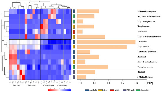 Heatmap of the differential volatile compounds (VIP > 1.0) between the test group and control group. The color scale represents the scaled abundance of each compound, indicated as the Z-score, with red and blue indicating high and low abundances, respectively. The histogram shows the VIP value.