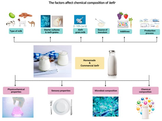 The factors that affect the composition of kefir (this figure was created using images from Pixabay (https://pixabay.com, accessed on 4 October 2022) and Biorender (https://app.biorender.com/, accessed on 4 October 2022).