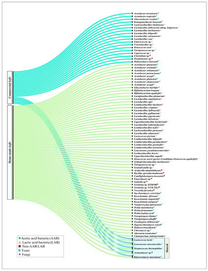 A Sankey diagram represented the total microbiota reported from both commercial and home-made kefir as reported through metagenomics studies. A total of 23 genus/species have been reported from commercial varieties, whereas about 66 have been reported form home-made kefir, which consists of lactic-acid bacteria (LAB), acetic-acid bacteria (AAB), non-AAB/LAB, yeasts, and fungi. Bacillota-associated lactic-acid bacterial species viz., Lactococcus lactis, Leuconostoc mesenteroides, and Streptococcus thermophilus; Pseudomonadota-associated species, Acinetobacter sp., and yeast- Kluyveromyces marxianus are the five most commonly shared microbes reported from the two varieties of kefir [,,,,,,,,,,,,,,,].