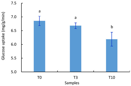 Effects of D. officinale on the glucose uptake of S. cerevisiae. T0, T3, and T10 were the samples with 0, 30, and 100 g/L of D. officinale, respectively. Different letters indicate significant differences at p < 0.05.