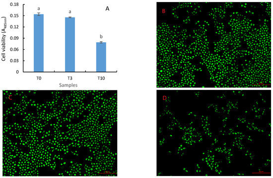 Effects of D. officinale on the cell viability of S. cerevisiae. T0, T3, and T10 were the samples with 0, 30, and 100 g/L of D. officinale, respectively. Different letters indicate significant differences at p < 0.05. (A): value of cell viability; (B): T0; (C): T3; (D): T10.