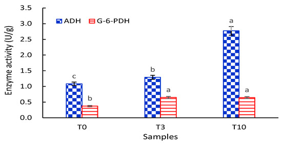 As shown in Figure 4, the ADH and G6PDH activities of S. cerevisiae were increased by the addition of D. officinale. Compared with the control (T0), the ADH activity was increased 1.84- and 2.25-fold, and the G6PDH activity was increased 1.74- and 1.76-fold, in samples T3 and T10, respectively.