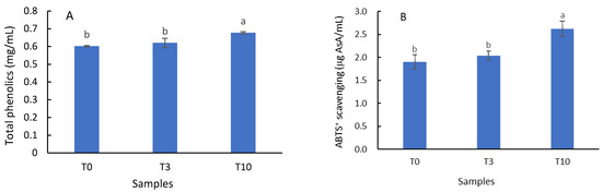 As shown in Figure 5, the total phenolic content of beer samples was increased by the addition of D. officinale. Among them, no significant (p > 0.05) difference in the total phenolic content was determined between T3 (0.62 mg/mL) and T0 (control, 0.60 mg/mL), while the total phenolic content in T10 (0.68 mg/mL) was significantly (p < 0.05) higher than that of the control—by 12.65%. The antioxidant activity evaluated by the ABTS radical cation decolorization assay showed higher values in the samples with added D. officinale (T3 and T10) as compared with the control (T0, 1.91 μg AsA/mL). As with the total phenolic content, the increase in ABTS radical scavenging ability was significant (p < 0.05) in T10 (2.62 μg AsA/mL), while it was insignificant (p > 0.05) in T3 (2.04 μg AsA/mL).