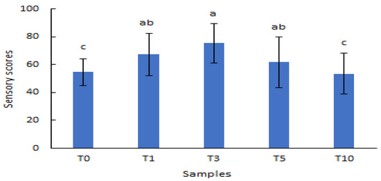 Sensory evaluation of beer samples fermented with D. officinale. T0, T1, T3, T5, and T10 were the samples with 0, 10, 30, 50, and 100 g/L of D. officinale, respectively. Different letters indicate significant differences at p < 0.05.
