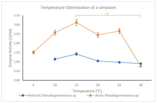 Temperature optimization of α-amylase obtained from Antarctic Pseudogymnoascus sp. and Arctic Pseudogymnoascus sp. (* p < 0.05).