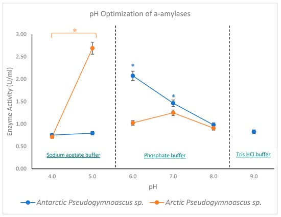 pH optimization using different buffers for α-amylase obtained from Antarctic Pseudogymnoascus sp. and Arctic Pseudogymnoascus sp. (* p < 0.05).