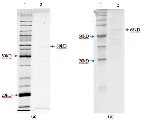 - Laemmli, U.K. Cleavage of structural proteins during the assembly of the head of bacteriophage T4. Nature 1970, 227, 680–685. [Google Scholar] [CrossRef]