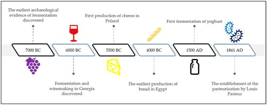 The fermentation process was found thousands of years ago and has been extensively practiced for its benefits in food preservation, nutrient enhancement, and alcohol manufacturing [31,32]. Traces of mixed fermentation in the form of an alcoholic beverages prepared from rice, fruits, and honey between 7000 and 6600 BC was found in pottery jars from the early Neolithic town of Jiahu, China, and was declared the earliest archaeological evidence of fermentation to have been discovered [33,34,35]. This makes fermented beverages, such as vinegar and wine, among the oldest fermented foods consumed by people [36,37]. Kimchi, for example, is a popular fermented food among Koreans and has become popular in other countries worldwide [38,39,40]. On the other hand, pickled cucumber is used not only when preparing burgers and sandwiches by Westerners, but also as a side dish in Asian countries [41,42]. Due to their distinct flavor and aroma, fermented foods and beverages become some of the first processed foods to be consumed by humans [31,43,44,45]. A brief timeline of fermentation’s history, from the earliest archaeological evidence of beverage fermentation until the introduction of pasteurization, is illustrated in Figure 1.