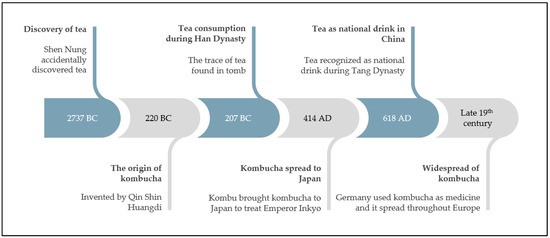 The fermentation of sugared black tea by a tea fungus, a symbiotic relationship between Acetobacteria and osmophilic yeasts, produces a healthy beverage called kombucha, as illustrated in Figure 2 [131,132,133]. Kombucha originated in China and has been consumed since 220 BC. The name “Kombucha” is derived from a Korean physician named Kombu, who brought tea fungus to Japan in 414 AD to treat Emperor Inkyo, who was suffering from digestive problems [131,132,133,134]. Currently, kombucha is produced traditionally in many households worldwide, including Malaysia, and its consumption is widespread, principally in Korea, China, Europe, and the United States, because of its refreshing taste and beneficial effects on human health [131,133]. Tea and kombucha originated in China, as illustrated in Figure 3.