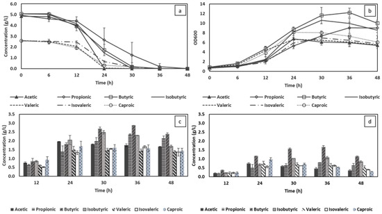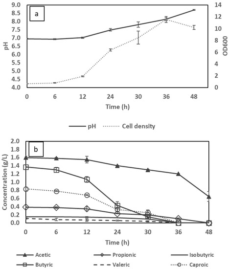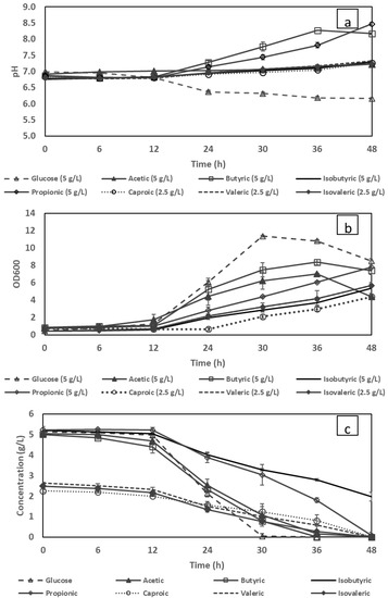 As expected, the consumption of VFAs resulted in an increase in pH level while for glucose, an opposite trend was observed [25,29]. The bacterial growth was also monitored by the measurement of cell densities which were in compliance with the VFA consumption trends throughout the cultivation (Figure 1b).